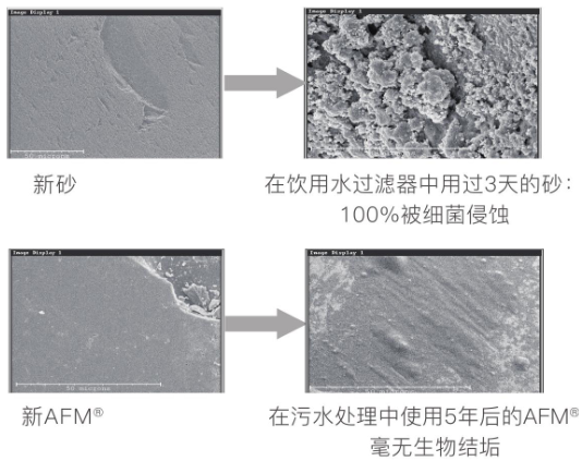 對(duì)大部分“水處理”系統(tǒng)而言,濾床是微生物滋生與繁殖的主要場(chǎng)所,因此解決濾床的微生物孳生與繁殖,是本系統(tǒng)的重要組成部分——AFM,作為一個(gè)蘇格蘭進(jìn)口產(chǎn)品,就是破解這一難題的環(huán)保選擇:用它取代容易滋生細(xì)菌的石英砂,可利用表面自消毒能力、讓細(xì)菌失去賴(lài)以生存的場(chǎng)所與食物,從而大大減少了整個(gè)水處理系統(tǒng)的微生物、減少了對(duì)消毒劑的依賴(lài)。