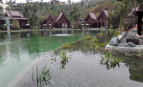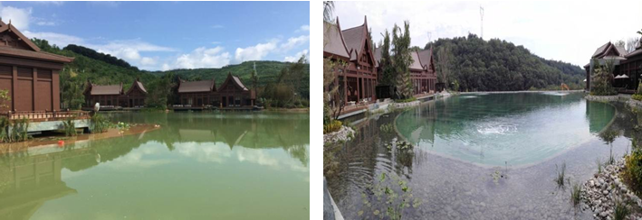 就以萬達(dá)西雙版納國(guó)際度假區(qū)來說,承擔(dān)了其酒店群的主樓前場(chǎng)、SPA區(qū)的兩個(gè)人工景觀湖水處理的改造項(xiàng)目,水面面積約8000m2、水量30000m3,處理后的水質(zhì)達(dá)到地表水Ⅲ類標(biāo)準(zhǔn),整個(gè)方案采用了“生態(tài)治理法+機(jī)械曝氣”的水處理工藝。