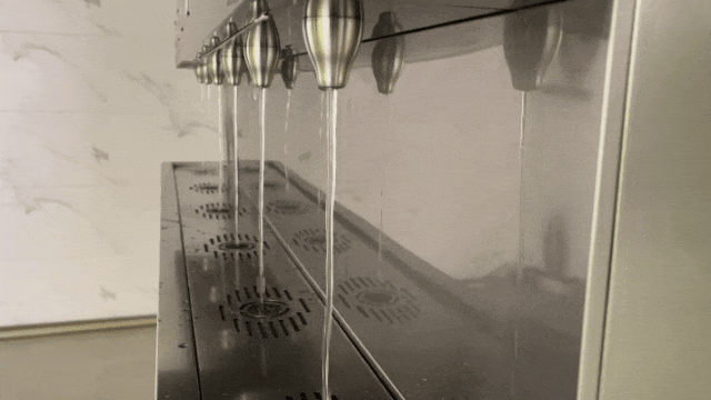 此次校園共配備戴思樂®校園凈飲水設(shè)備8臺,搭載反滲透負壓勻柔流專利技術(shù),確保出水純凈,水流穩(wěn)定;采用“兩開四溫”可調(diào)模式(開水配“童鎖”功能),每臺設(shè)備設(shè)有6個出水嘴,且均配置紫外消毒功能;同時,接水臺還加裝防濺面板,構(gòu)建安全、健康的接飲水環(huán)境。